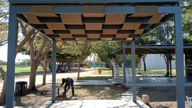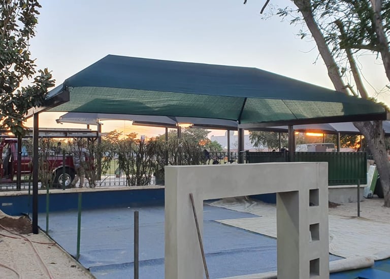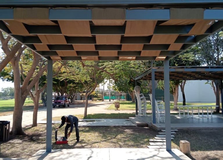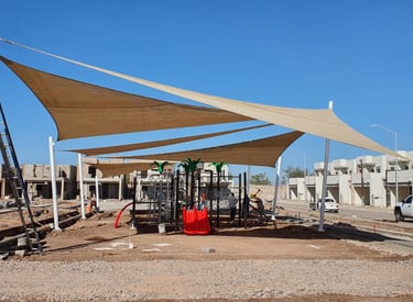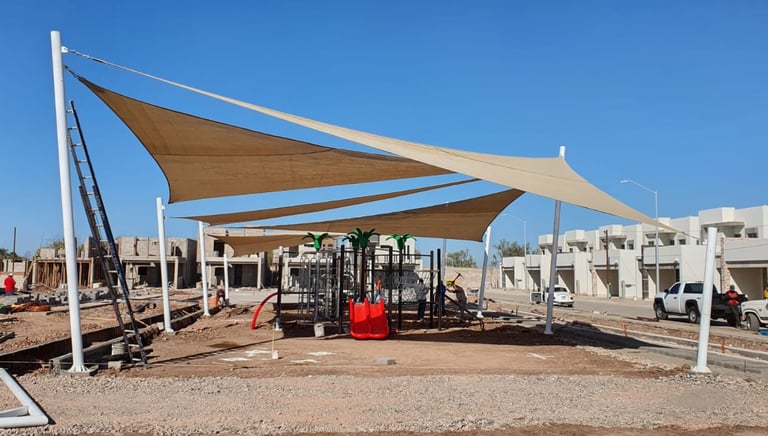 Diseño y montaje de mallasombras para áreas recreativas. Creamos espacios de convivencia frescos y modernos desde los cimientos.