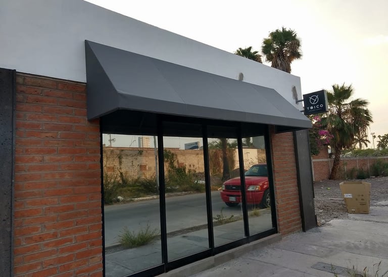 Fabricación e instalación de toldos fijos para fachadas. Estructura nueva y lona tensada para máxima visibilidad y protección de tu negocio.